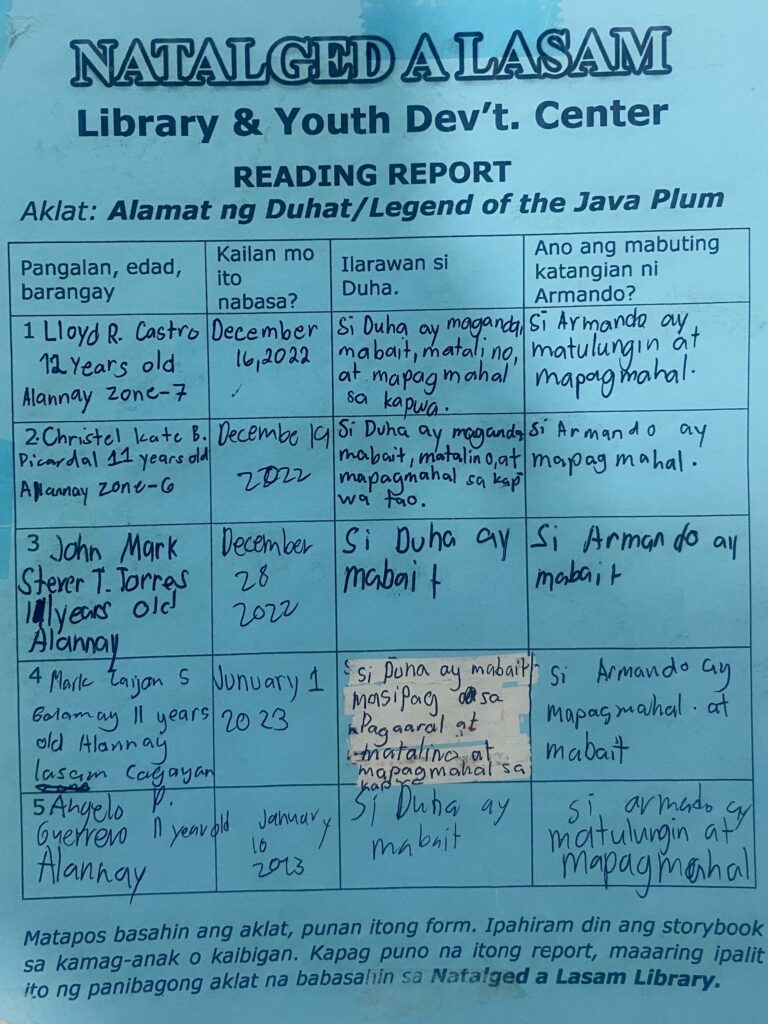 Natalged a Lasam Storytelling and Reading Caravan. This is LGU's legislated “Feed the Body, Feed the Mind,” both as a school- and community-based health and reading promotion program. To instigate beginning reading, storytelling sessions using highly visual big books are conducted among Daycare, Kinder, and Grades 1 to 3 pupils creating sparks of discovery to engender appreciation for reading. After a session, participants—in pairs—are asked to select a storybook to read together or after each other, before exchanging this to their neighbor or a school mate.
